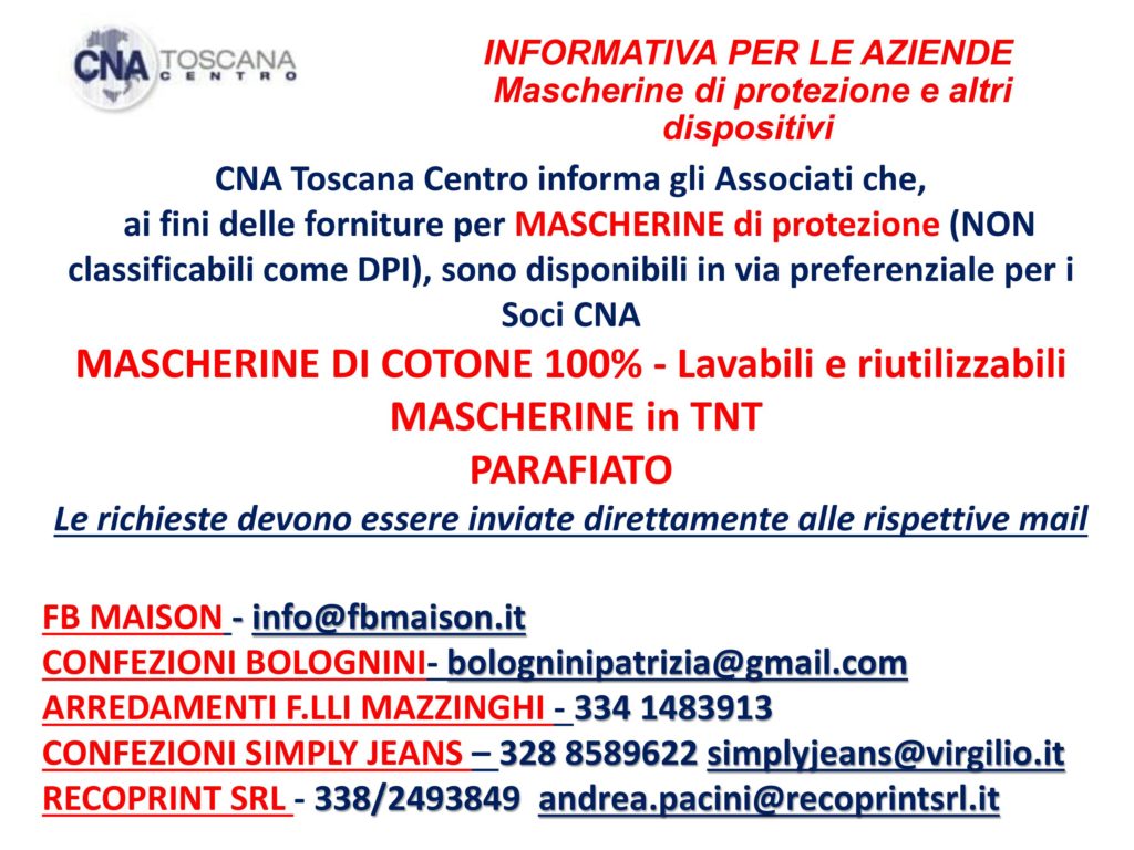 CNA TOSCANA CENTRO informa gli Associati che, ai fini delle forniture per MASCHERINE di protezione (NON classificabili come DPI), sono disponibili […]