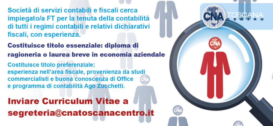 Società di servizi contabili e fiscali cerca impiegato/a full time per la tenuta della contabilità di tutti i regimi contabili e relativi dichiarativi fiscali, con esperienza.