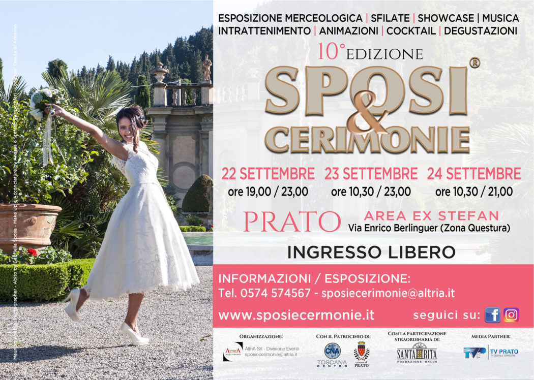 “SPOSI & CERIMONIE” giunge quest’anno alla sua X Edizione,  è la mostra che anticipa a Prato tutte le tendenze e le novità del settore Wedding, nonché la prima in calendario. Riunendo categorie di espositori di primaria importanza e alto livello qualitativo, fornisce un’ottima occasione di orientamento per tutti coloro che stanno organizzando il loro giorno più bello. Oltre a servizi, consulenze, offre un ricco programma di eventi live di intrattenimento, con musicisti, cantanti e animatori cui i visitatori potranno assistere. La kermesse si terrà da Venerdì 22 a Domenica 24 Settembre.