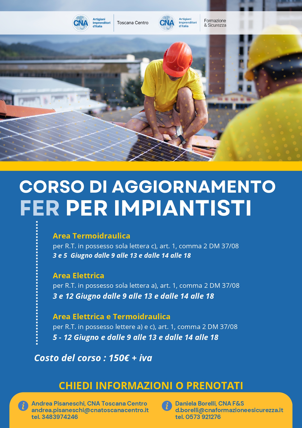 CNA Toscana Centro insieme a CNA Formazione e Sicurezza organizzano il corso di aggiornamento per impiantisti che installano impianti energetici alimentati da fonti di energia rinnovabile (FER) ed effettuano la manutenzione ordinaria degli stessi.