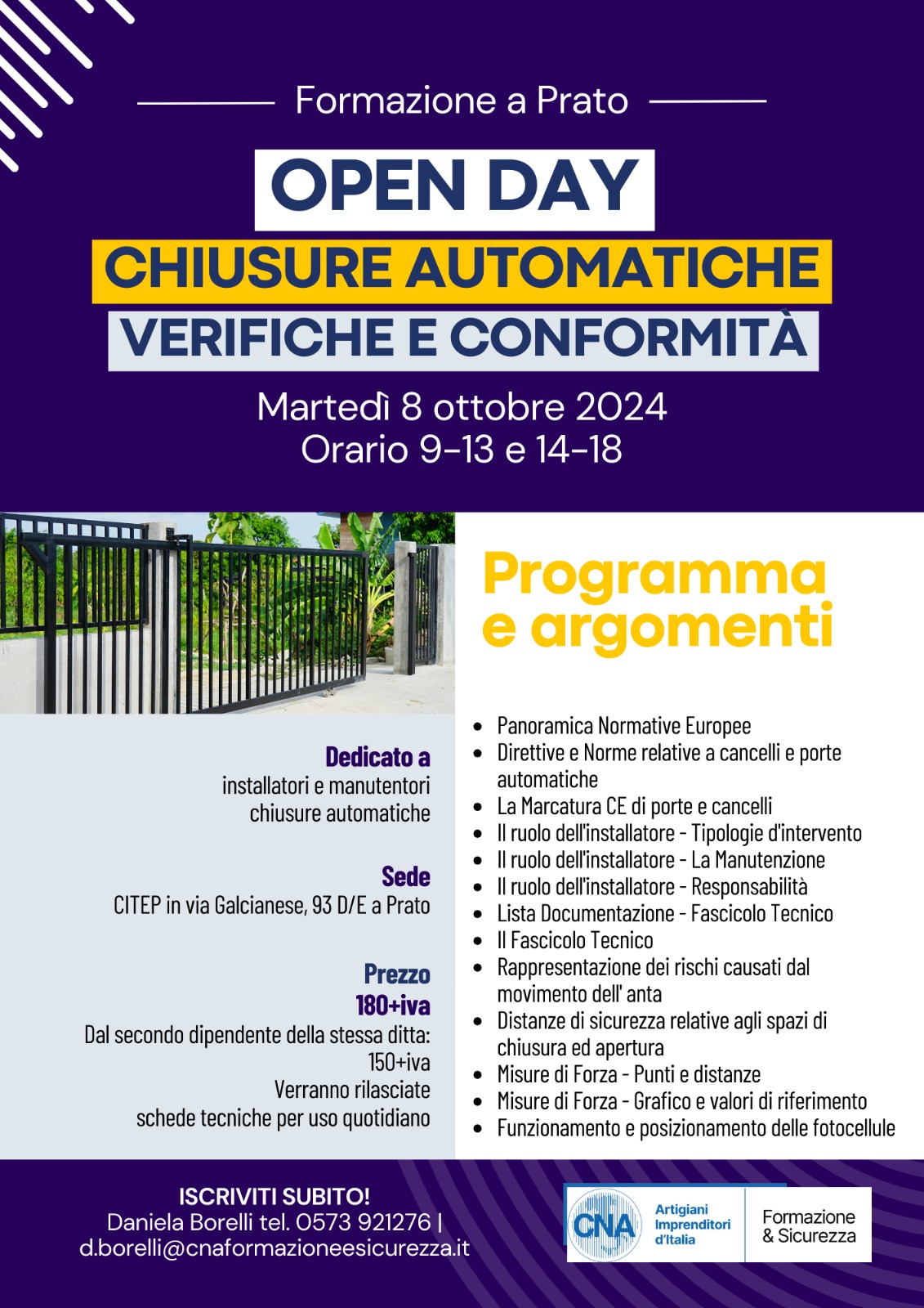 Un nuovo corso tecnico di formazione rivolto a installatori e manutentori di chiusure automatiche, secondo tutte le più recenti normative e le direttive specifiche del settore.