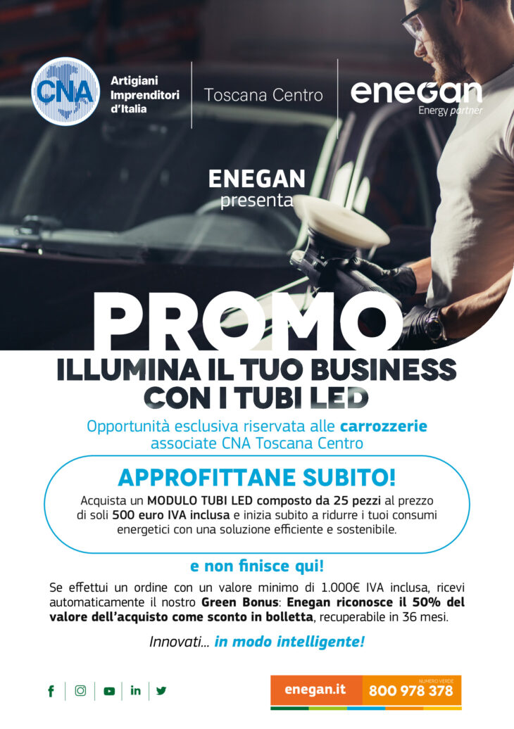 Si apre un’opportunità esclusiva riservata alle carrozzerie associate CNA Toscana Centro grazie alla partnership con Enegan che consente un duplice vantaggio: l’acquisto a prezzi vantaggiosi di tubi Led che sono fondamentali per l’attività di una carrozzeria e, dall’altro lato, la possibilità di attestare il costo della manodopera grazie al servizio esclusivo erogato dalla nostra associazione.