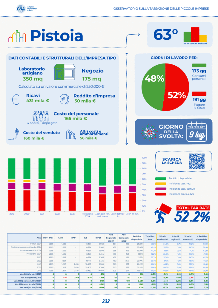 Più precisamente, nella classifica nazionale che rileva un lieve calo della tassazione sulle imprese personali – dal 52,8% del 2023 al 52,3% del 2024 con consistenti divari territoriali – e partendo dalla graduatoria nazionale che evidenzia la città con minore pressione fiscale (Bolzano) e quella con maggiore peso fiscale (Agrigento), Prato e Pistoia si piazzano rispettivamente al 42° e 63° posto registrando un Total Tax Rate (cioè un carico fiscale generale tra tasse nazionali e locali) pari al 52% (Pistoia) e al 51% (Prato). Nell’arco di quest’anno, dunque, le imprese pistoiesi lavoreranno ben 191 giorni solo per pagare le tasse e 175 giorni per il proprio reddito, mentre per quelle pratesi i giorni di lavoro per lo Stato saranno pari a 188 contro i 178 giorni di lavoro per sé stesse.