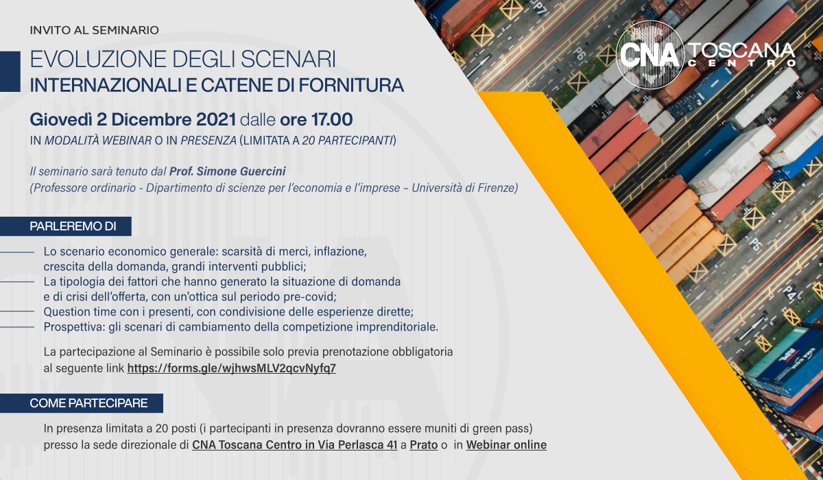 CNA Toscana Centro organizza un seminario sulle questioni più significative dell’attuale scenario economico generale, l’evento tenuto dal Prof. Simone Guercini* si svolgerà Giovedì 2 dicembre 2021 dalle ore 17.00 in modalità webinar oppure in presenza (limitata a 20 partecipanti).