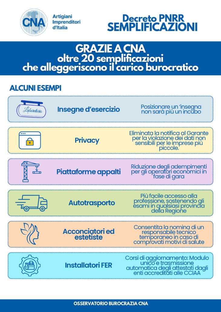 Con l’adozione del decreto PNRR da parte del Consiglio dei Ministri si completa un pacchetto di oltre 20 misure di semplificazione più volte sollecitate dalla CNA. Si tratta di misure che toccano direttamente in Italia oltre 800mila imprese e potenzialmente quelle interessate sono oltre un milione.
